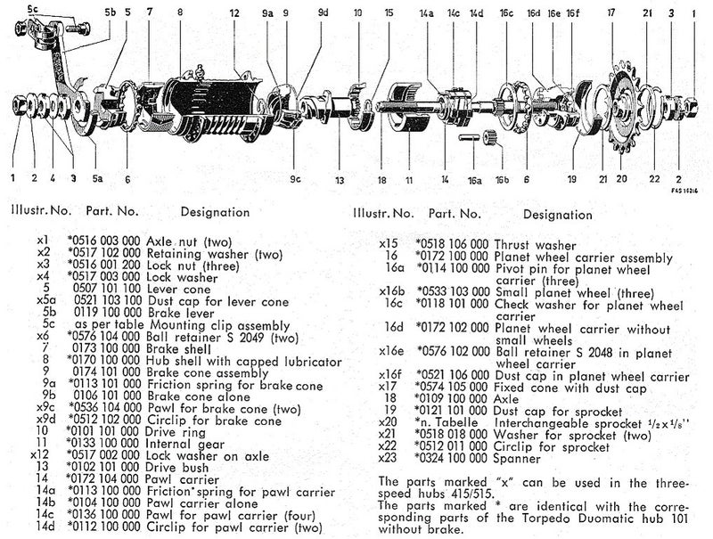 De platte as (10,5mm) met losse frictieschijven zorgt voor de opname van het koppel. De naven hebben 24, 28 of 36 spaakgaten. De lengte van de achteras is 146 of 156mm. Een onderdeel in deze naven, dat voor problemen zorgt, is meeneemring (nummer 10 van de exploded view FIG.1b); deze breekt nogal eens. De meeste onderdelen uit de naven 101 en 102 zijn identiek; in de onderdelen beschrijving van type 102, ziet u dat sommige onderdelen zelfs uitwisselbaar zijn met de drie-bak 415/515. De onderdelen zijn niet altijd uitwisselbaar met de opvolger R2110.
