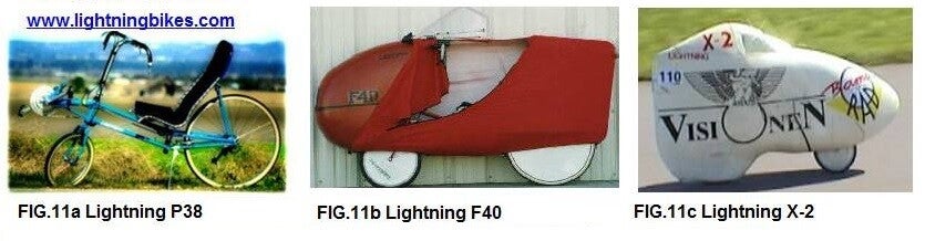 A design of Kingcycle that is often used, is the tent bike. We see a picture of such a bike, the American Lightning F40 in FIG. 11b; a fixed nose cone and tail cone with in between a kind of tent, made of Lycra. It is the dressed-up version of their standard model P38 (FIG. 11a). The F40 is reasonably suitable for everyday use and has had great success in the Race Across AMerica (RAAM). This is a difficult race: with 4 riders 4680 km non-stop (121 hours, 38.7 km/h average)! However, the Cd-value of that bike will not be lower than 0,5 and the frontal area is approximately 0,4 m². A usable full faired bike , that is also at stable in cross-winds, is not easy to design. I would not like to ride the Lightning X-2 from FIG. 11 c in windy weather. Probably combinations of a tailcone and a windshield, like Zzipper or HP Velotechnik Streamer, are a better compromise. Check out http://www.fietsanders.nl/ at Vicap.