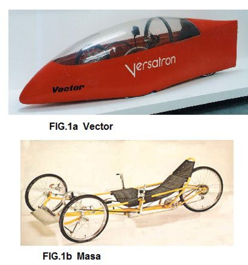 The tandem version of the Vector FIG.1a was the first human powered vehicle to break the 100km / h limit (in 1980). The streamline of the Vector was designed first; the tricycle is built in it. If it really has to go fast, the construction is completely subordinate to the aerodynamics. Below the fairing is a simple tricycle similar to the Masa (1978) of FIG.1b; in this case with rear-wheel drive and front-wheel steering. There are many ways to build tricycles. We have to make choices when designing: which wheel or wheels do we use for the drive and which for the steering. Sometimes we combine drive and steering on the front and / or rear wheels. We will look at some examples of all solutions.