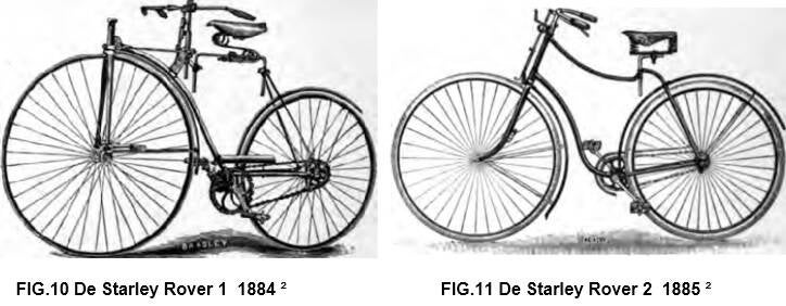 Door de spaken kruisend te monteren, ontstond een wiel dat deze krachten wel kon opnemen. Veel fabrikanten begrepen dit helemaal niet en monteerden gewoon meer spaken, soms wel meer dan honderd. De "hoge bi" of "highwheeler" begon zich te ontwikkelen; dunne stalen spaken en lichte framebuizen reduceerden het gewicht. Eind jaren zeventig wogen sportuitvoeringen van de highwheeler minder dan 13kg. Toch was vanwege het valgevaar, het rijden van dit soort fietsen voorbehouden aan jonge mannen. Het zwaartepunt van de highwheeler lag te ver naar voren. Natuurlijk was het probleem maar al te bekend en er waren ook ontwerpen die veiliger waren. Om de rijder verder naar achter te zetten, werden in plaats van pedalen wel hefboomconstructies gebruikt, zoals bij de Singer Xtraordinary en de American Star. Bij die laatste werd achterwiel aangedreven en dient het voorwiel alleen om te sturen. Dit was ook het geval bij de Lawson Safety uit 1878, die had zelfs al een kettingaandrijving. Met de ontwikkeling van de kettingaandrijving op het achterwiel, gaat de rijder lager (tussen de wielen) zitten. Dit model staat bekend als de "safety bicycle". De wielen worden bij de Starley Rover2 (FIG.11) even groot. De ontwikkelingen bleven snel gaan; na twintig jaar was de ordinary net zo verouderd als de boneshaker.