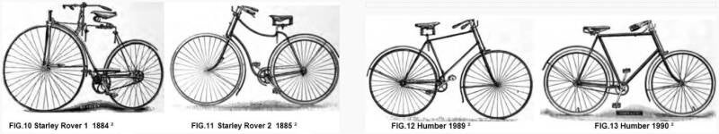 By mounting the spokes crosswise, a wheel was created that could absorb these forces. Many manufacturers did not understand this at all and simply installed more spokes, sometimes more than a hundred. The "high bi" or "highwheeler" began to develop; thin steel spokes and light frame tubes reduced weight. In the late 1870s, sports versions of the highwheeler weighed less than 13kg. Still, because of the risk of falling, riding these bicycles was reserved for young men. The center of gravity of the highwheeler was too far forward. Of course the problem was all too known and there were designs that were more secure. To move the rider further back, levers were used instead of pedals, like we see on the Singer Xtraordinary and the American Star. In the latter, the rear wheel was driven and the front wheel only served to steer. This was also the case with the Lawson Safety from 1878, which even had a chain drive. With the development of the chain drive on the rear wheel, the rider sits lower (between the wheels). This model is known as the "safety bicycle". The wheels are the same size on the Starley Rover2 (FIG. 11).