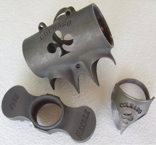 FIG.2 Gazelle soldeerdelen met het hertenlogo; Cinelli bracket en twee verschillende vorkkronen van BoCaMa (BCM). De vlindervormige soldeerstukjes voor de achtervork waren ook typisch voor Gazelle.