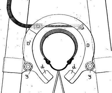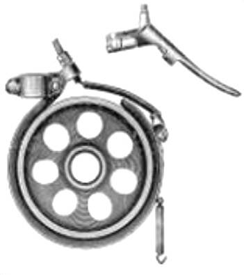 In FIG.2 & 3 we see a front and rear brake from 1898. The front brake FIG.3 works with a push rod (plunger brake). Alas it does not work when you have a flat tire, a disadvantage. The rearbrake uses a handle, a complicated system of rollers and a cable. A rotating handgrip was used to transmit the power to the brake.The invention of the inner- and outer cable combination by Bowden in 1897 (FIG.4), made that outdated.