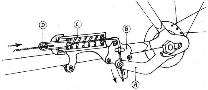 With the development of the pneumatic tire, plunger brakes become less effective; the air in the tire limits the force that is exerted. Instead of braking on top of the tire, new brakes (FIG.9) press on the underside of the rim, by brake blocks mounted on a horseshoe shaped brake. This pull brake is usually operated by a rod system. The braking effect in the rain is poor. The firm of Raleigh has used these brakes until the seventies; we still see these brakes on oriental clones. Around 1905, the BSA company made a pull brake (FIG.10) that was operated by a clutch on the bottom bracket axle, but you combine the disadvantages.