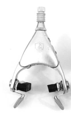 The centerpull brake has two pivots; both brakeblocks move simultaniously to the rim.. As a result, the wear of the blocks is even. With the Mafac brake of FIG.13 and the Resillion of FIG.14, the pivot point is close to the brake pad. Due to the circular movement of the brake and wear of the brake pad, it is wise to check regularly if the brake surface still fits properly on the rim. Otherwise there is a risk that the brake pad holder can slide under the rim. The centerpull brake was standard on end 50's and 60's racing bikes.