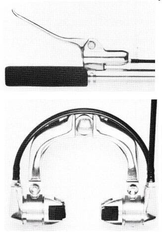 The Altenburger Synchron (FIG.16) has two pivots but is operated from the side; both brake parts move the brakepads to the rim. This is also the case with the Weinmann from FIG.15 , but here the cable operates a screw-vise to get more pressure on the brakeblocks.