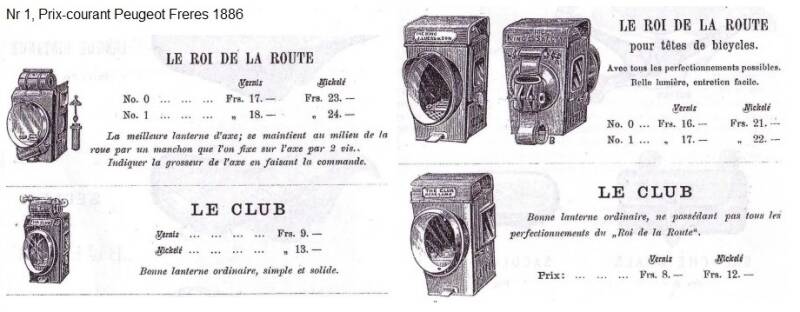 FIG.1 Olielampen in de folder van Peugeot uit 1886. De lampen links hingen aan de draaiende as van de Hoge-bi. De lampen rechts werden op het stuur of balhoofd gemonteerd (ook te gebruiken bij Safety's).