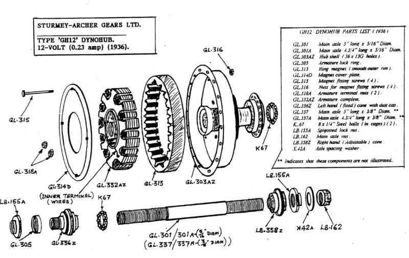 FIG.7a Sturmey Archer naafdynamo (1936) ; deze naaf was 12V, maar er waren ook 8V en 6V naven.