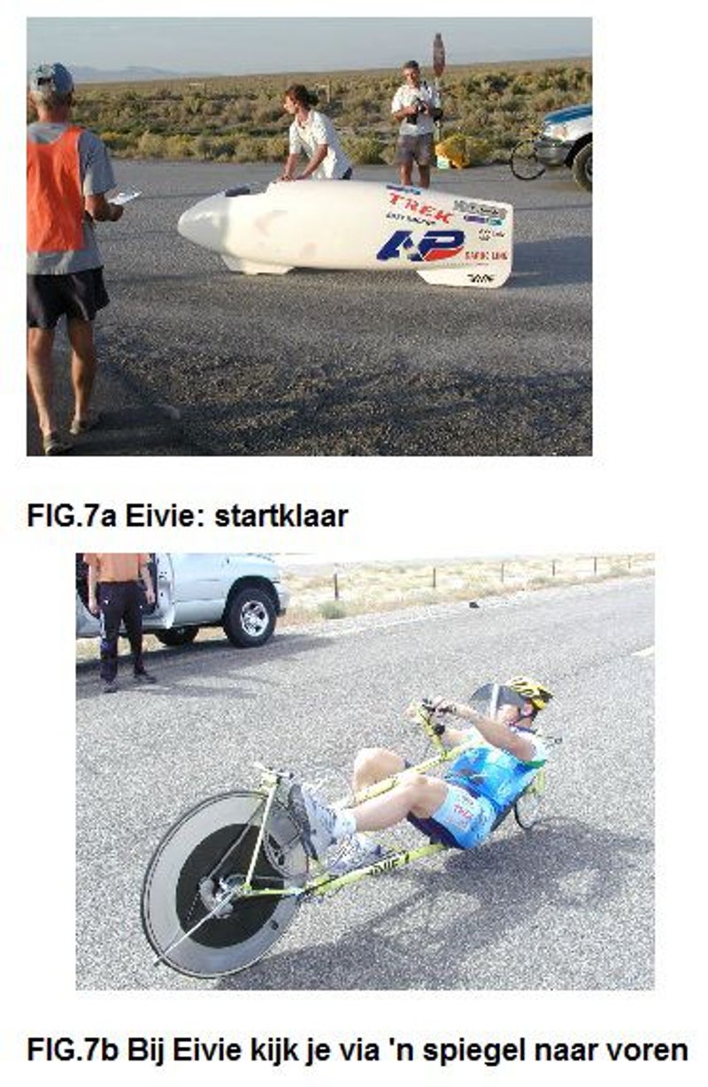 Hier zien we enkele van de snelste fietsen op dit moment. De geschatte Cw-waarde is 0,1. Virtual Rush is een radicaler ontwerp. Er is voor de rijder geen uitzicht via een raampje, maar er is een camera met een schermpje gemonteerd (geschatte Cw is 0,09). Vermoedelijk is de Eivie (FIG.7a) het ontwerp met de laagste Cw-waarde: circa 0,07. De rijder zit/ligt met z'n rug in de rijrichting en kijkt via een spiegeltje door een miniem venster naar voren. Het frontaal oppervlak van deze ontwerpen is rond de 0,2m². Bij Virtual Rush zien we een staartvlak verschijnen (extra weerstand!); ook het uiteinde van Eivie neigt naar zo'n staartvlak. Het blijkt dat een zeer goede aerodynamica de stabiliteit op hoge snelheid vermindert; een verschijnsel dat al bekend was van sport-wagens en gemotoriseerde snelheidsrecords. Je zou het kunnen verbeteren door het drukpunt van de lucht achter het zwaartepunt te schuiven, maar dan vermindert de zijdelingse stabiliteit.... (de wet van Cruiff). Om redelijk stabiel te zijn bij zijwind, moet het drukpunt van de lucht voor het zwaartepunt liggen. Varna scoort hier beter dan Eivie en Virtual Rush; die zouden de neus verder omlaag kunnen trekken, maar dat kost weer extra vermogen.